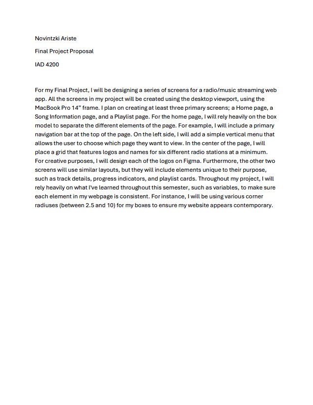 For this project, I will create a proposal outlining my plans for the final project. I will define what I want to pursue, making sure the scope is manageable within the 2.5-week timeframe, not including the break. Once the proposal is approved, I will carry out the project according to the plan.